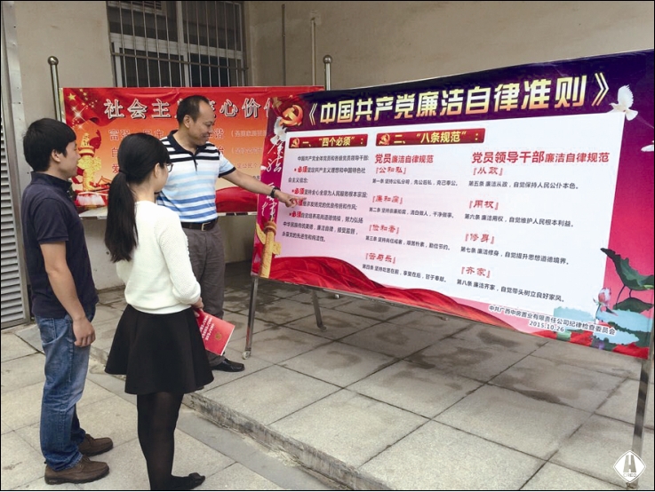 為增強(qiáng)學(xué)習(xí)貫徹的自覺(jué)性、主動(dòng)性,把學(xué)習(xí)貫徹與具體工作實(shí)際結(jié)合起來(lái),公司紀(jì)檢監(jiān)察室在第一時(shí)間進(jìn)行宣傳貫徹。一是以短信形式,向公司全體黨員和中層以上干部發(fā)送2期《廉政知識(shí)學(xué)習(xí)卡》短信,并就“妄議中央”、“老鄉(xiāng)會(huì)、校友會(huì)、戰(zhàn)友會(huì)”、“四類人員不得買賣股票”、“社會(huì)主義核心價(jià)值觀”等內(nèi)容分4次發(fā)送短信進(jìn)行解讀,以最快捷的方式、最簡(jiǎn)潔的字句讓黨員干部及時(shí)了解和知曉《準(zhǔn)則》和《條例》的關(guān)鍵內(nèi)容;二是組織黨委中心組成員集中專題學(xué)習(xí);三是制作四版《準(zhǔn)則》和《條例》宣傳版報(bào),分別布置于二樓、三樓辦公走廊;四是為全體黨員訂購(gòu)人手一份《中國(guó)共產(chǎn)黨廉潔自律準(zhǔn)則、中國(guó)共產(chǎn)黨紀(jì)律處分條例、中國(guó)共產(chǎn)黨章程》單行本,全部發(fā)放到每一位黨員手中,要求原原本本、逐字逐句認(rèn)真學(xué)習(xí);五是在公司OA信息系統(tǒng)黨務(wù)紀(jì)工團(tuán)門戶發(fā)布通知學(xué)習(xí)。