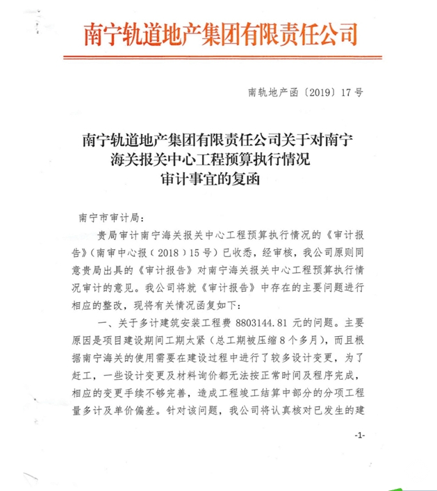 南寧軌道地產(chǎn)集團(tuán)有限責(zé)任公司關(guān)于對(duì)南寧海關(guān)報(bào)關(guān)中心工程預(yù)算執(zhí)行情況審計(jì)事宜的復(fù)函